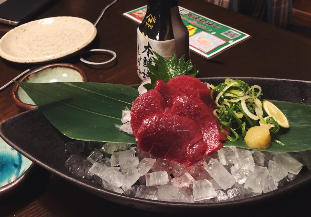 I tasted basashi, or horse sashimi, for the first time at an izakaya. Horse meat is also known as sakuraniku (cherry blossom meat) because of its appearance and history. It looks like tuna, tastes like lamb but less gamey, and is very chewy. Later on, I chose basashi as my topic when we were asked to present on unique foods in Japan.